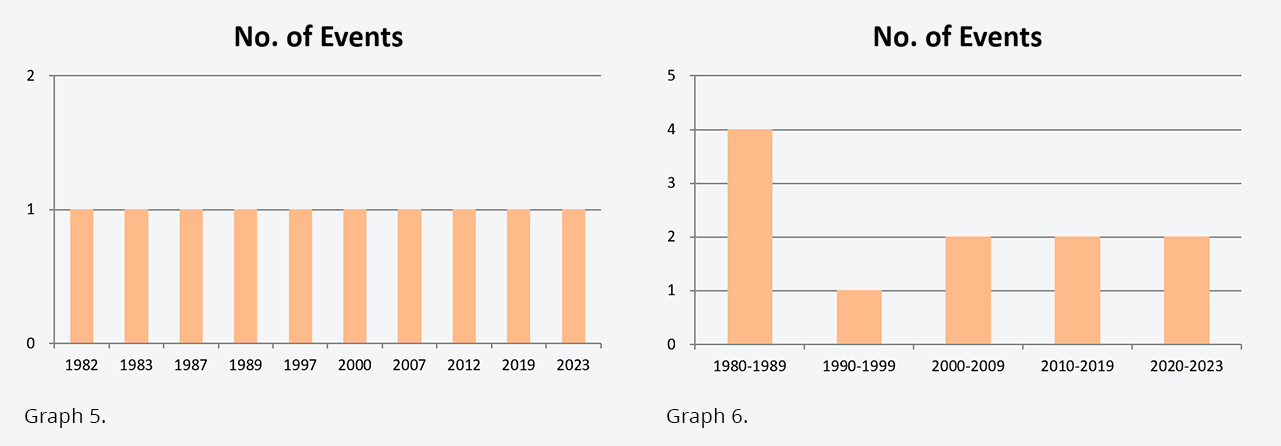 The last 6 of the 10 events discussed above have been separated out for further consideration, because more detailed data are available for these more recent events following installation of a computerised large event claim management system in 1996.