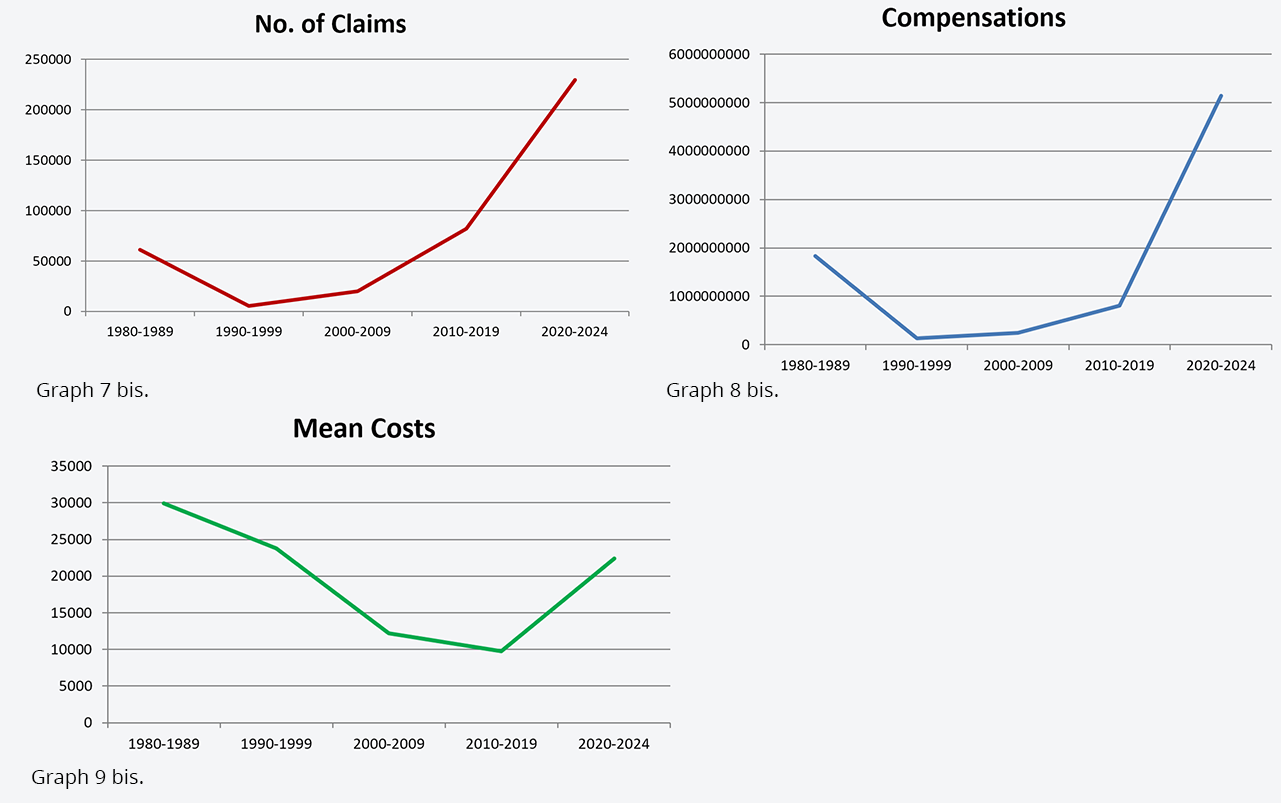 | DECADE | No. of EVENTS | No. of CLAIMS | COMPENSATIONS | MEAN COST |