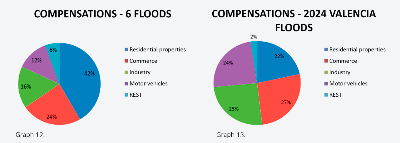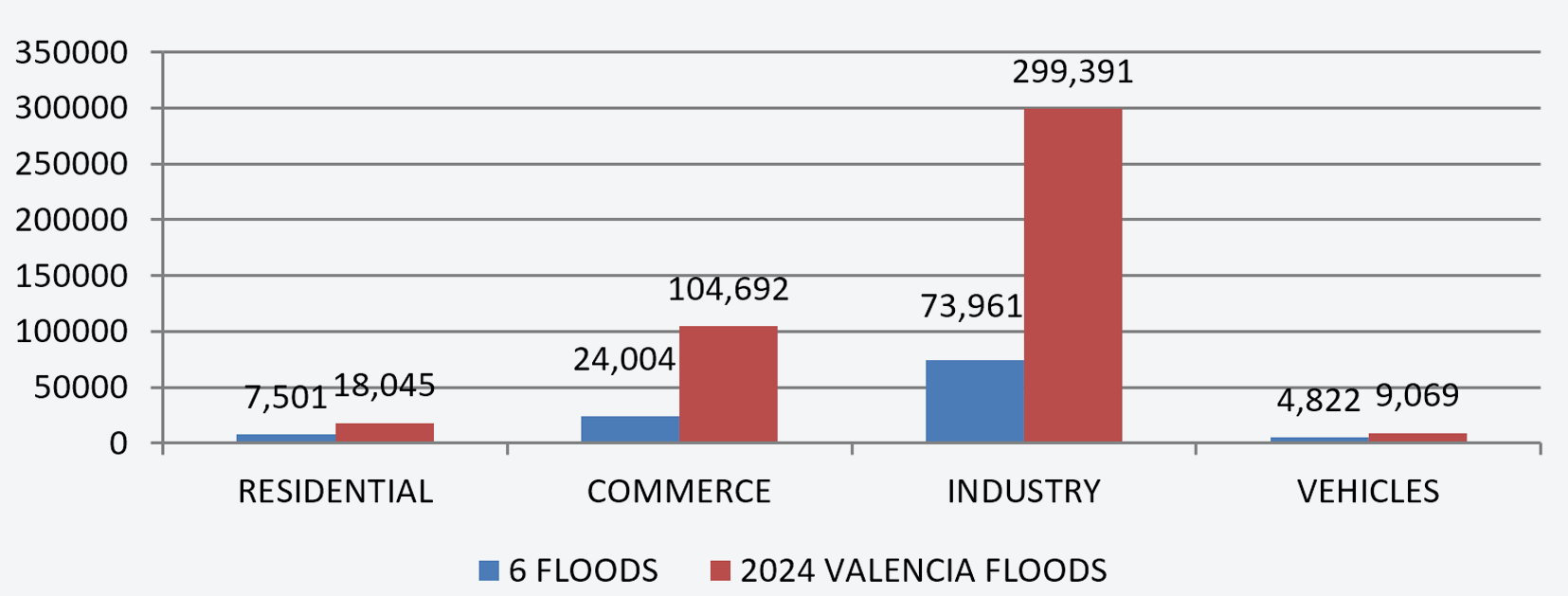 For the 6 largest earlier floods, 13% of claims were for businesses plus industrial plant, which accounted for 40% of compensations, while for the 2024 Valencia Floods 8% of claims were for business plus industrial plant accounting for 52% of compensations, highlighting the vulnerability of these categories of risk in the floods considered.