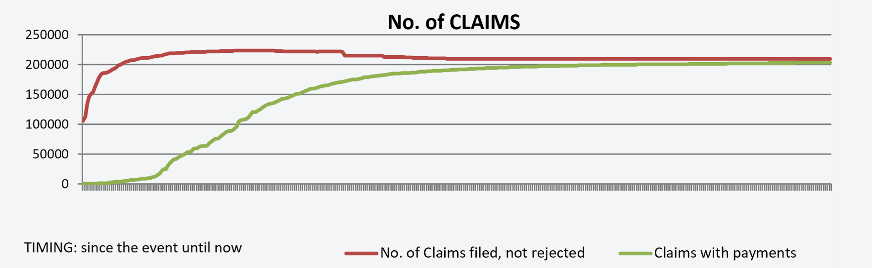 It can be seen that as already mentioned above, a massive number of claims came in during the first weeks. As the losses were assessed, payouts began, and at this time payouts are still pending for only a small percentage of claims.