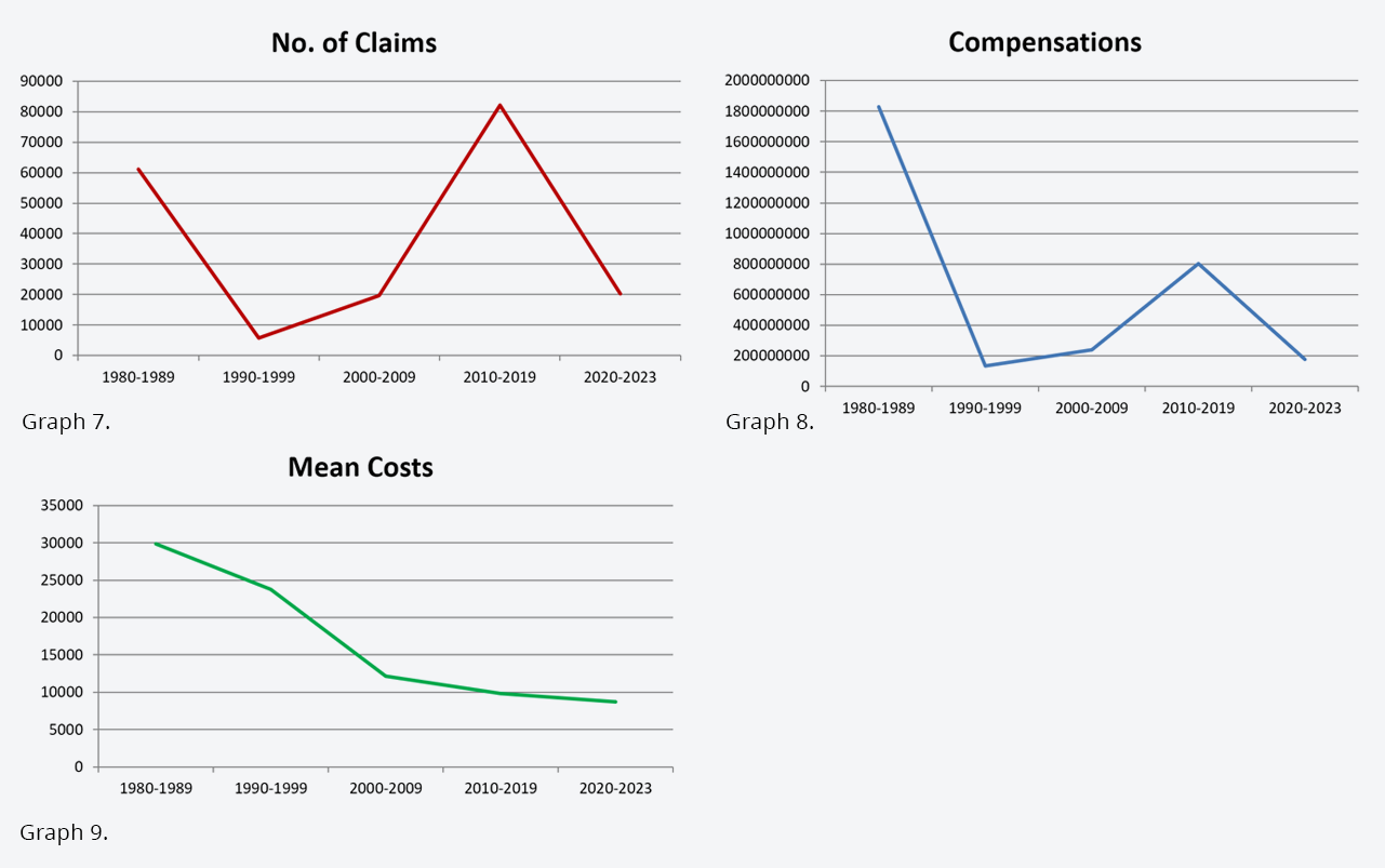 | DECADE | No. of EVENTS | No. of CLAIMS | COMPENSATIONS | MEAN COST |