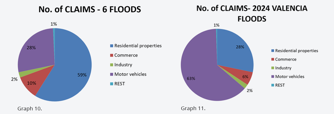 For the 6 largest earlier floods, 13% of claims were for businesses plus industrial plant, which accounted for 40% of compensations, while for the 2024 Valencia Floods 8% of claims were for business plus industrial plant accounting for 52% of compensations, highlighting the vulnerability of these categories of risk in the floods considered.