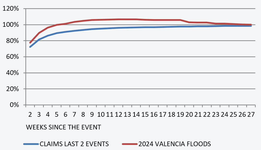 In some weeks, the total claims filed for the 2024 Valencia Floods were greater than 100% of the final total. This was because there was duplicate processing of claims due to the special nature of this event, though this was corrected as the weeks went by.