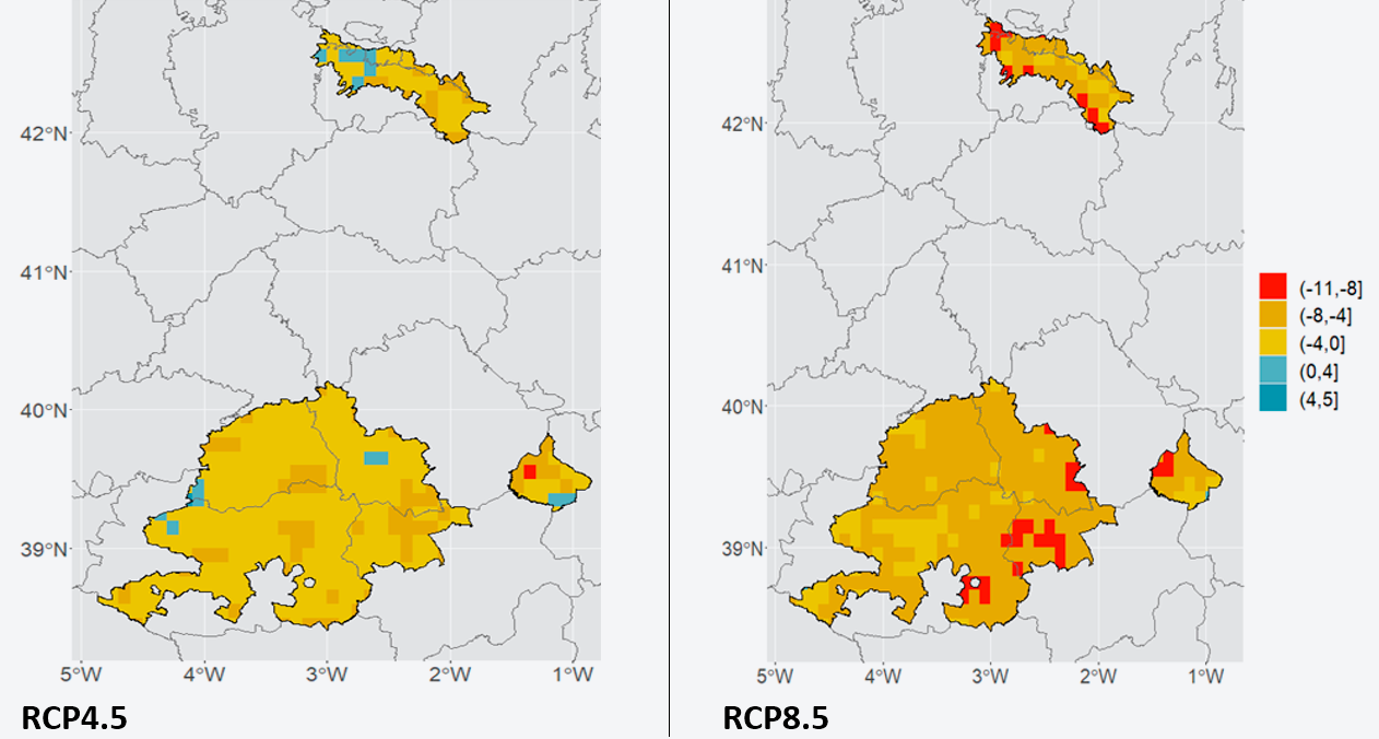 Figura 3: Proyecciones de cambio de la fecha de la última helada (días) durante la primavera en distintas D.O. (Rioja, La Mancha-Ciudad Real, Utiel-Requena) entre el periodo 1990-2019 (presente) y 2020-2049 (futuro próximo) en el escenario de emisiones GEI del RCP4.5 y RCP8.5. Números negativos es un adelanto en días, números positivos en un retraso en días.